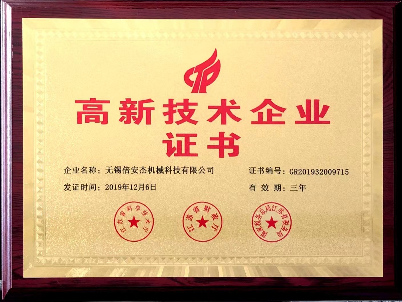 榮獲江蘇省高新技術(shù)企業(yè)